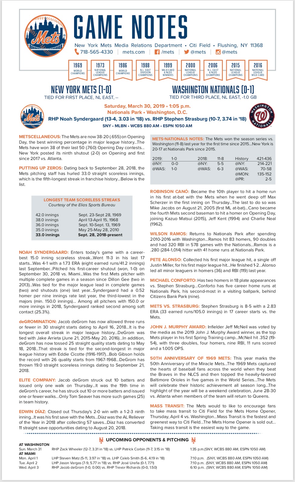 When asked by The Post about the trip, Syndergaard offered his dissent, saying, “We’re going to Sarasota and then to Syracuse, and then we are not going to New York. You would think we would go to New York to get like, as adults, our affairs in order, but no we have to go to Syracuse first. “I don’t know whose idea it was, but it’s not a smart one. I don’t think that’s conducive for winning ballgames really. … It doesn’t make much sense.’’ Especially since the Mets and deGrom are facing three-time Cy Young winner Max Scherzer right off the bat Thursday in Washington. The Mets also have a difficult turnaround before their home opener, playing a night game in Miami and then a 1:10 p.m. start the next day at Citi Field for the home opener April 4. It’s going to be a whirlwind week.Read more here.